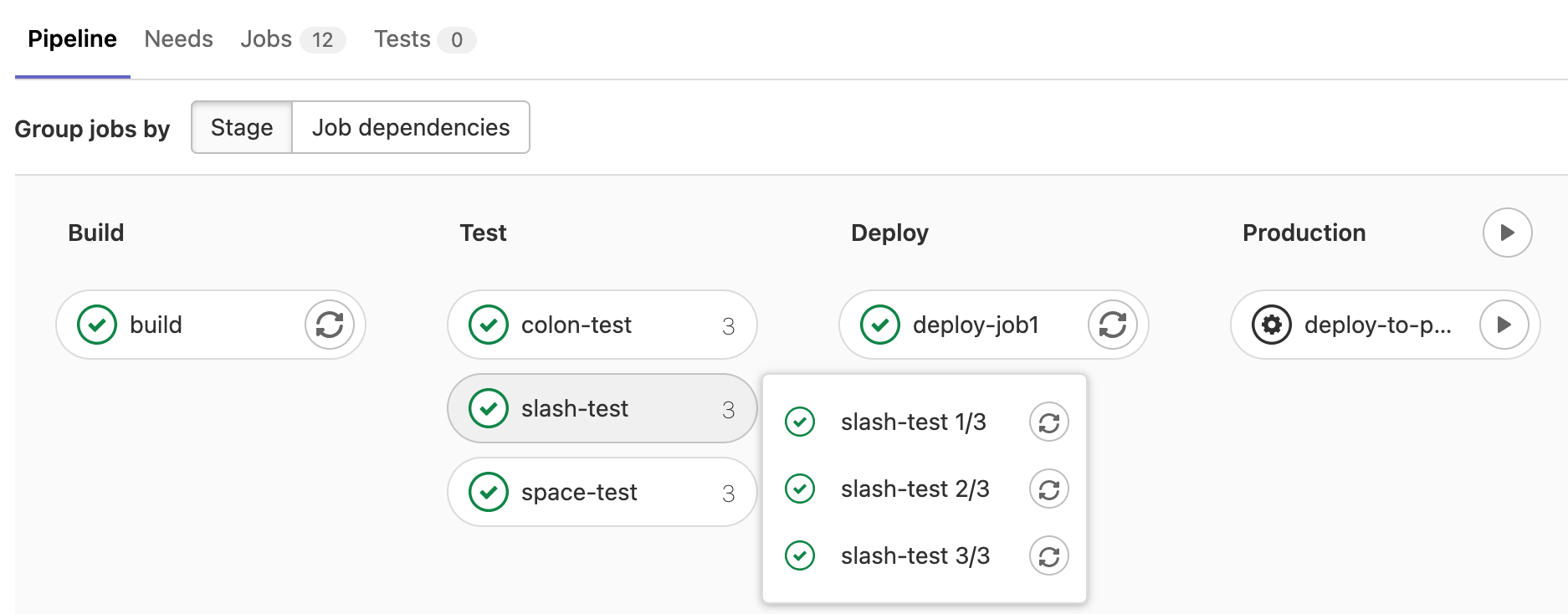 You can recognize when a pipeline has grouped jobs if you don't see the retry or cancel button inside them. Hovering over them shows the number of grouped jobs. Click to expand them.