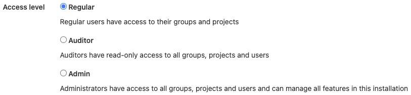 To view the administrator access level, in the GitLab UI, go to the Admin Area and select Users. Then select New user.