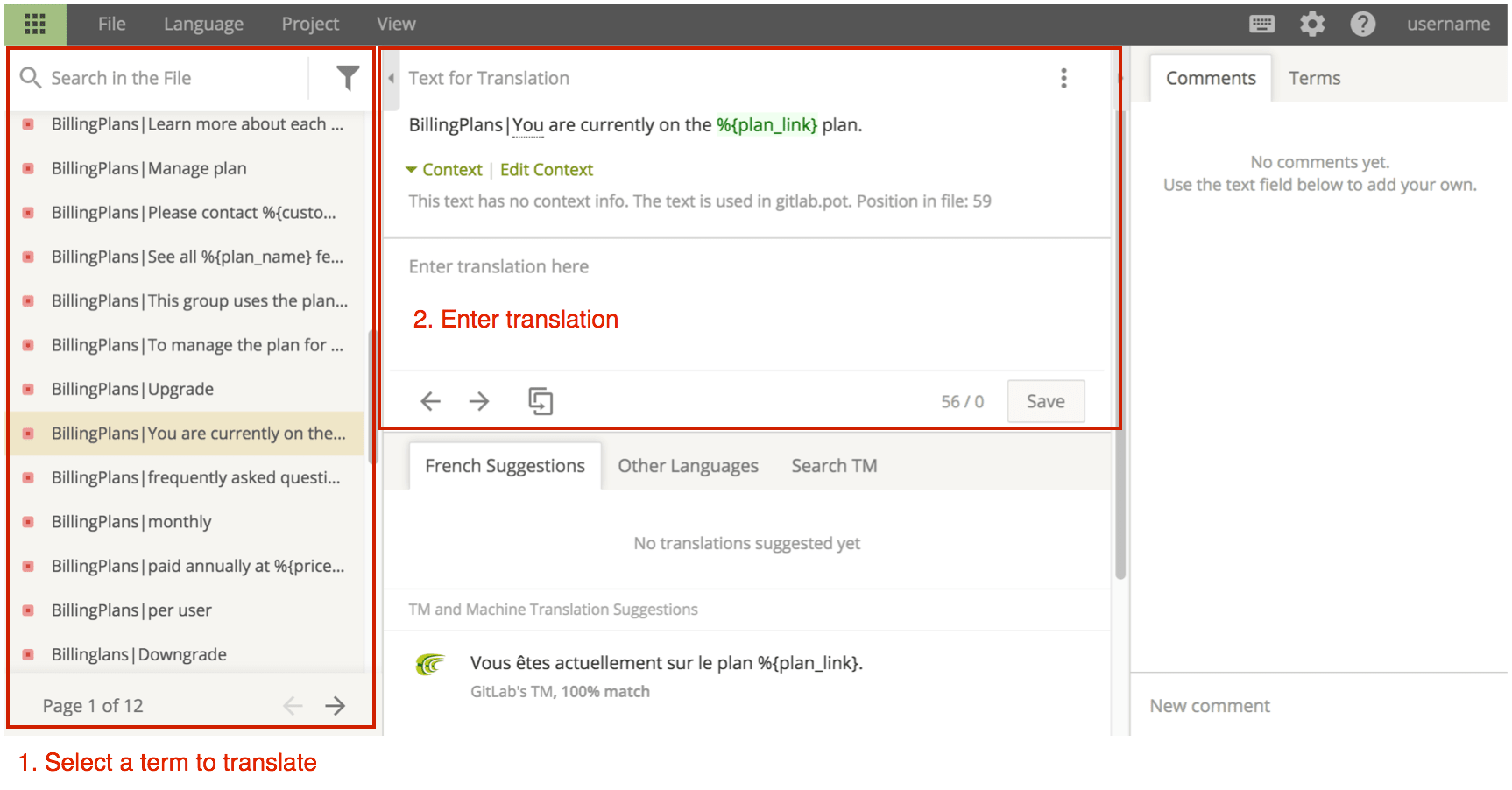 A glossary of common terms is available in the Terms tab in the right panel. In the Comments tab, you can add comments to discuss a translation with the community.
