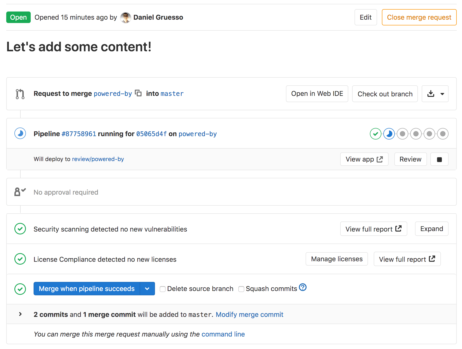 After submitting the merge request, GitLab runs your pipeline, and all the jobs in it, as described previously, in addition to a few more that run only on branches other than the default branch.