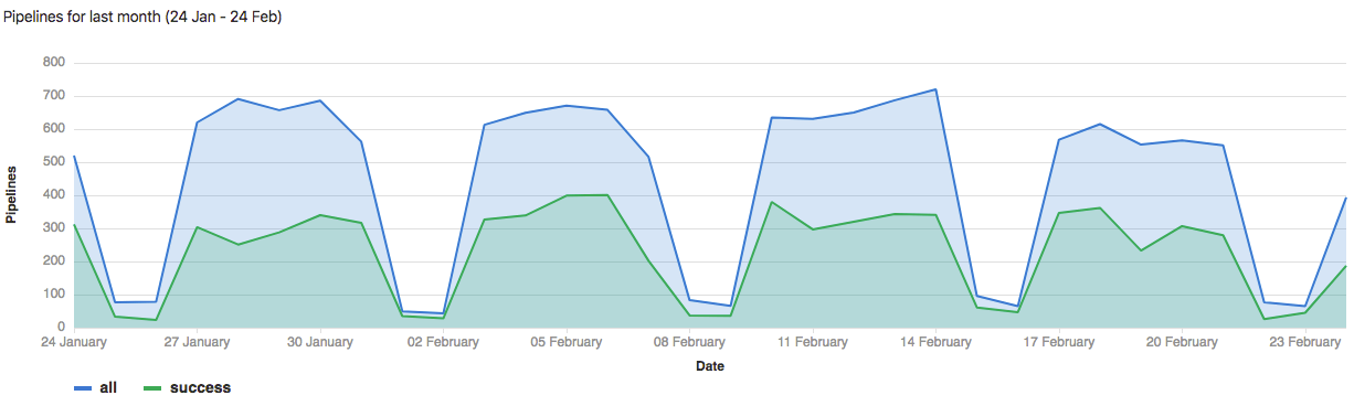 Pipeline statistics are gathered by collecting all available pipelines for the project regardless of status. The data available for each individual day is based on when the pipeline was created. The total pipeline calculation includes child pipelines and pipelines that failed with invalid YAML. If you are interested in filtering pipelines based on other attributes, consider using the Pipelines API.