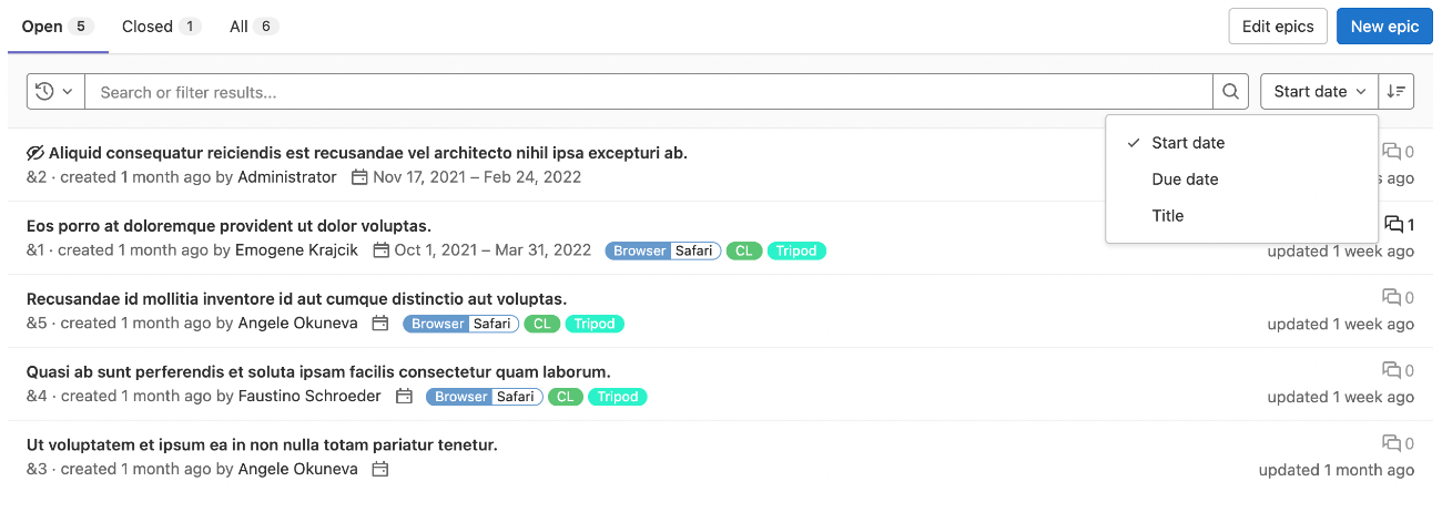 You can search for an epic from the list of epics using filtered search bar based on following parameters:
