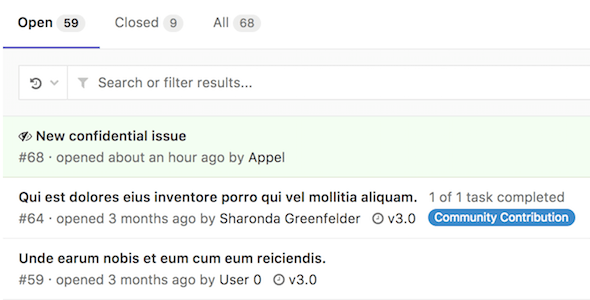 There are a few things that visually separate a confidential issue from a regular one. In the issues index page view, you can see the eye-slash ((eye-slash)) icon next to the issues that are marked as confidential: