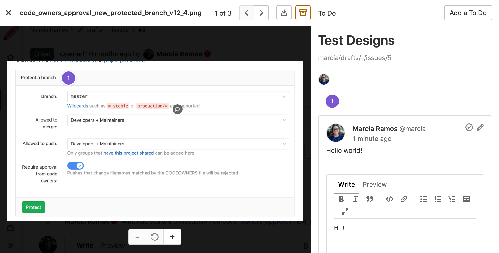 We support referring to designs in Markdown, which is available throughout the application, including in merge request and issue descriptions, in discussions and comments, and in wiki pages.