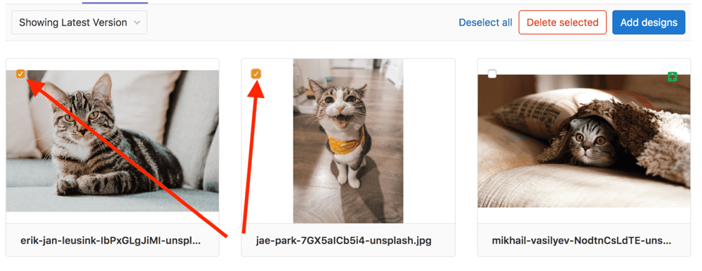 To delete multiple designs at once, on the design's list view, first select the designs you want to delete: