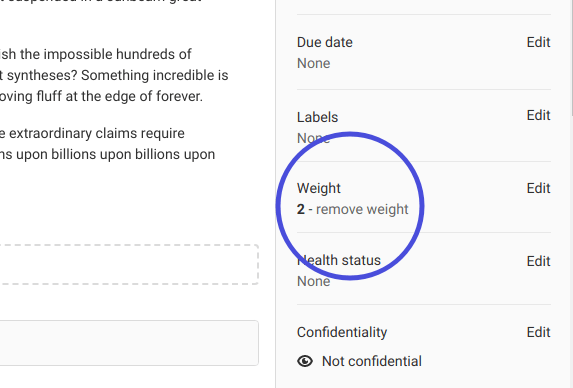 This value appears on the right sidebar of an individual issue, as well as in the issues page next to a weight icon ({weight}).