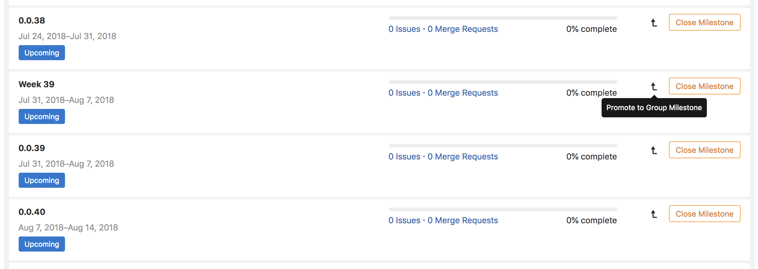 If you are expanding the number of projects in a group, you might want to share the same milestones among this group's projects. You can also promote project milestones to group milestones in order to make them available to other projects in the same group.