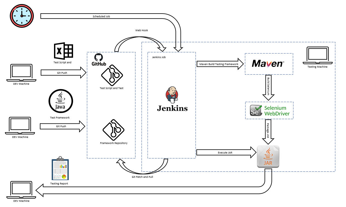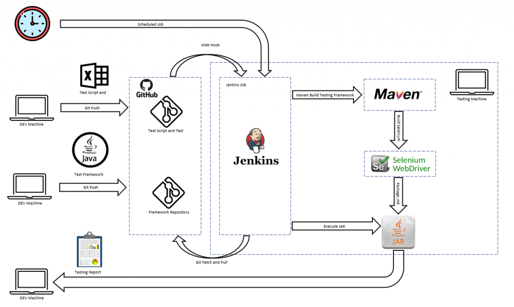 For detail implementation of the whole architecture, please refer to the other article: Integrate Git, Maven and Jenkins to Automate Selenium Testing
