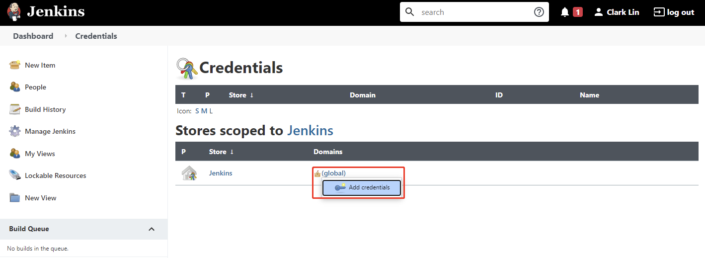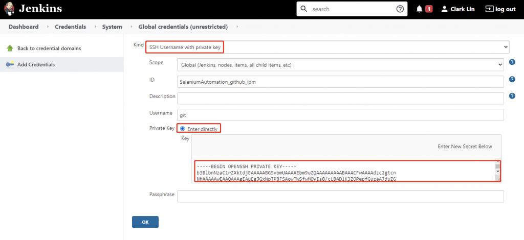 - Manage Credentials. Because Jenkins need to fetch and pull data from Git repository, it needs the credential to access Github. To access Github, it is recommended to use SSH key which has higher security level. Here in the credential management page, choose “SSH Username with private Key” as credential kind, and manually input private key content in the Key area. SSH key can be generated using this guide: https://docs.github.com/en/enterprise-server@2.21/github/authenticating-to-github/generating-a-new-ssh-key-and-adding-it-to-the-ssh-agent. By default, private key is named as id_rsa, and it is exactly which we need here. The other file id_rsa.pub is public key which is required later when we configuring Git repository.