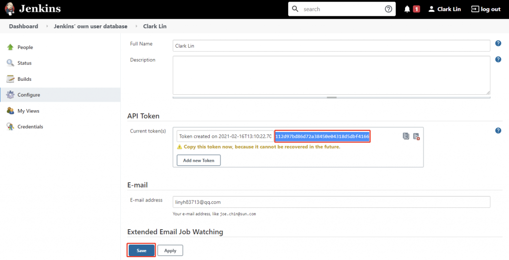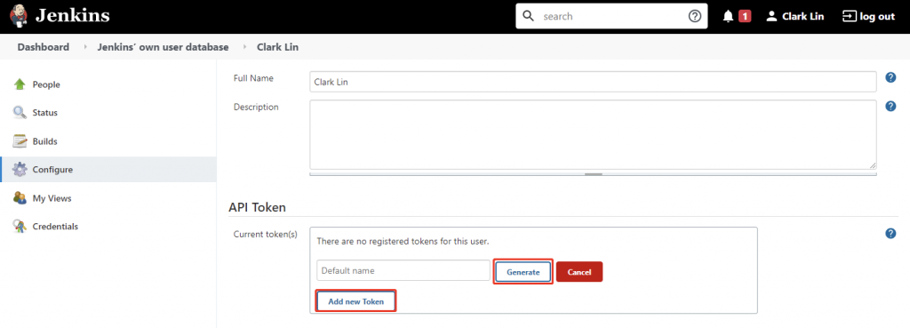 Add and generate new API token for user. This is necessary if Jenkins job is designed to be auto triggered from Git web hook.