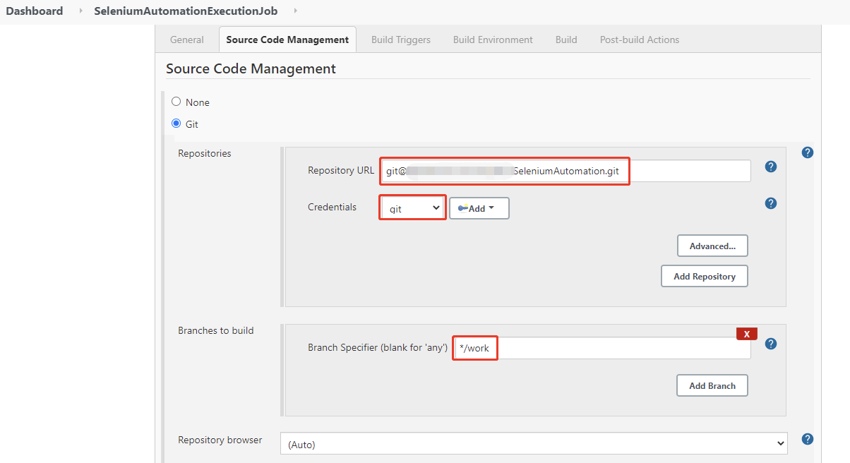 Provide repository URL of Selenium Automation repository, provide credential of what we just created, and choose the Git repository branch which we want to monitor:
