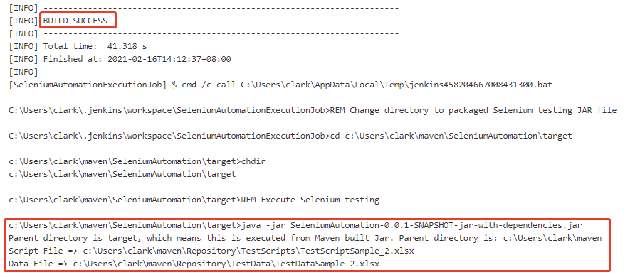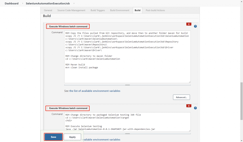 Add following windows batch commands to execute Maven build, package as well as Selenium testing execution. In Linux there are equivalent shell commands to perform the same operations.