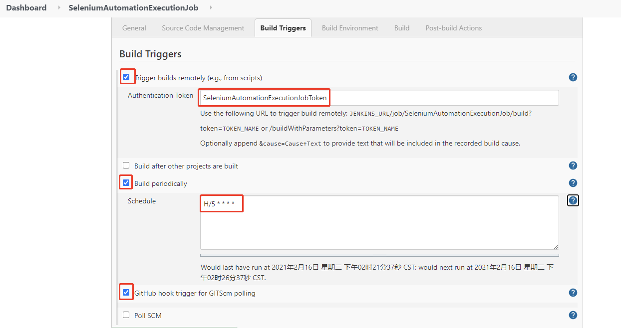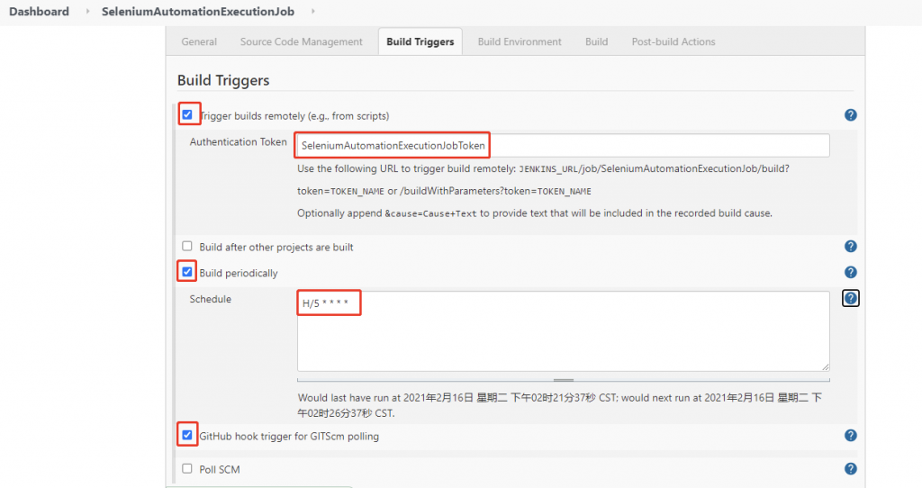 - Checking the box for “Build periodically” enables the job to be scheduled and executed at regular interval.