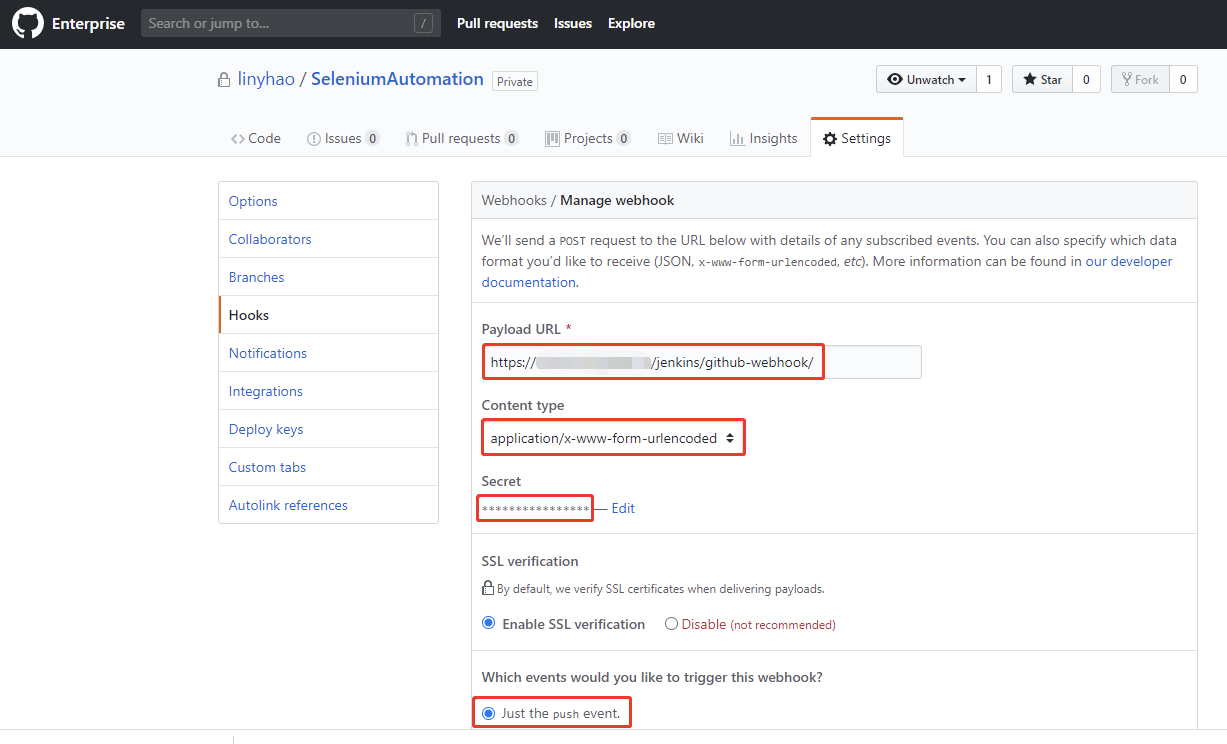 Payload URL is public URL of Jenkins with fixed suffix “github-webhook”. Content type can be left as default. Secret the the API token which has been generated in previous Manage User step in Jenkins configuration. By default, web hook is configured for Git push event, but it can be customized as per individual requirement.