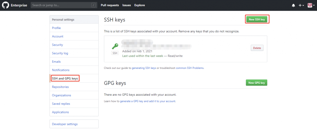 Click “SSH and GPG keys” and then “New SSH Key”. This should be the public key id_rsa.pub generated in previous step.