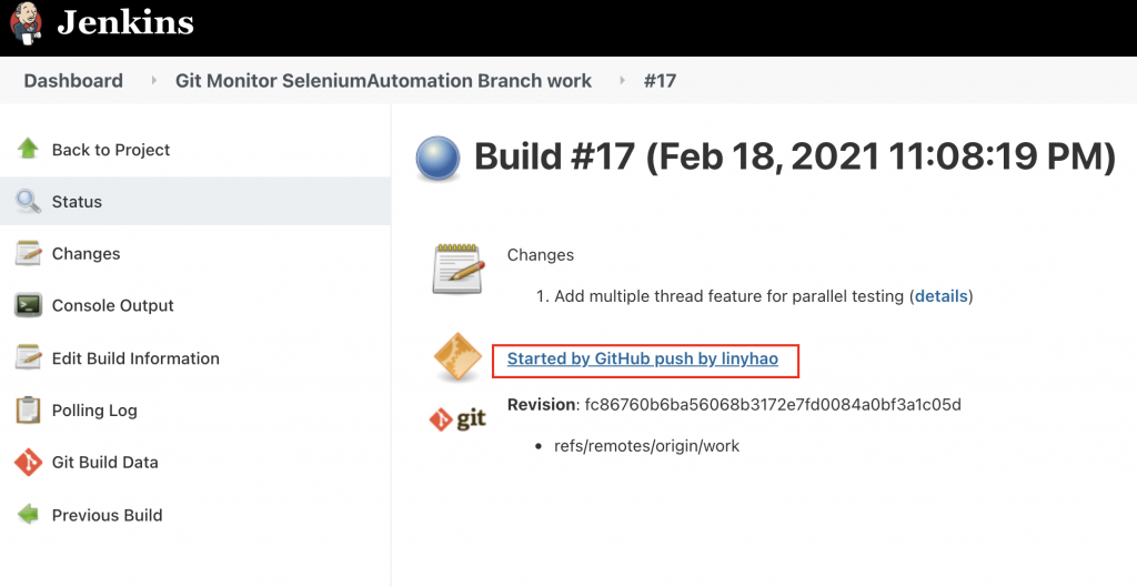 This is the core setup of continuous integration among Git, Jenkins, Maven and Selenium. Jenkins job is created to be auto triggered by Git push, and then it coordinates Maven build, package, and testing execution.