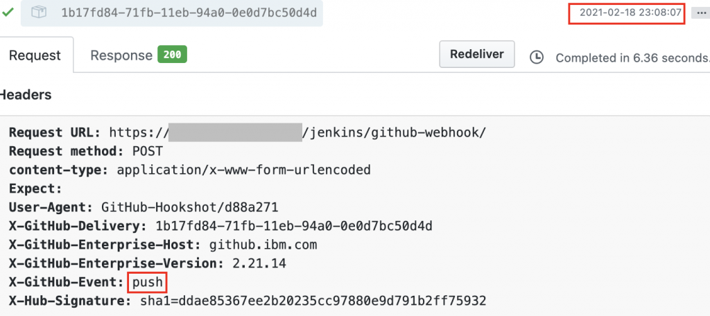 Here we are using another Jenkins instance hosted in public network to finish the POC. In Jenkins job GitHub Hook Log, verify Jenkins has received the web hook. In this case, it doesn’t detect new push, so the build is not triggered. If there is new push detected, the job will be executed automatically.