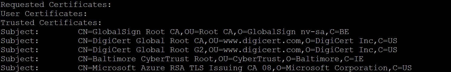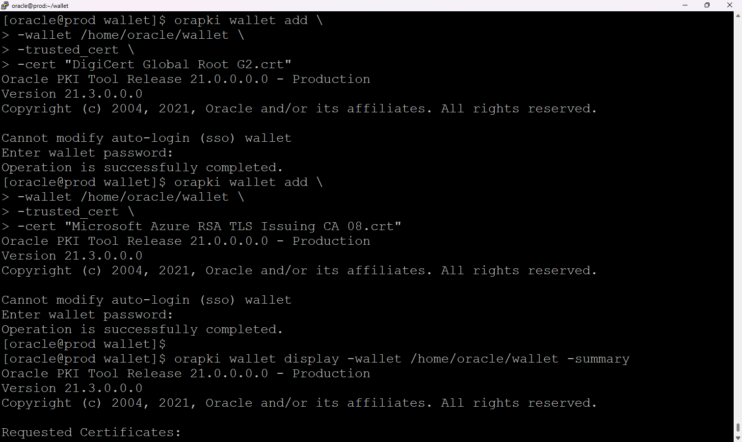 orapki wallet add -wallet /home/oracle/wallet -trusted_cert -cert "Microsoft Azure RSA TLS Issuing CA 08.crt"